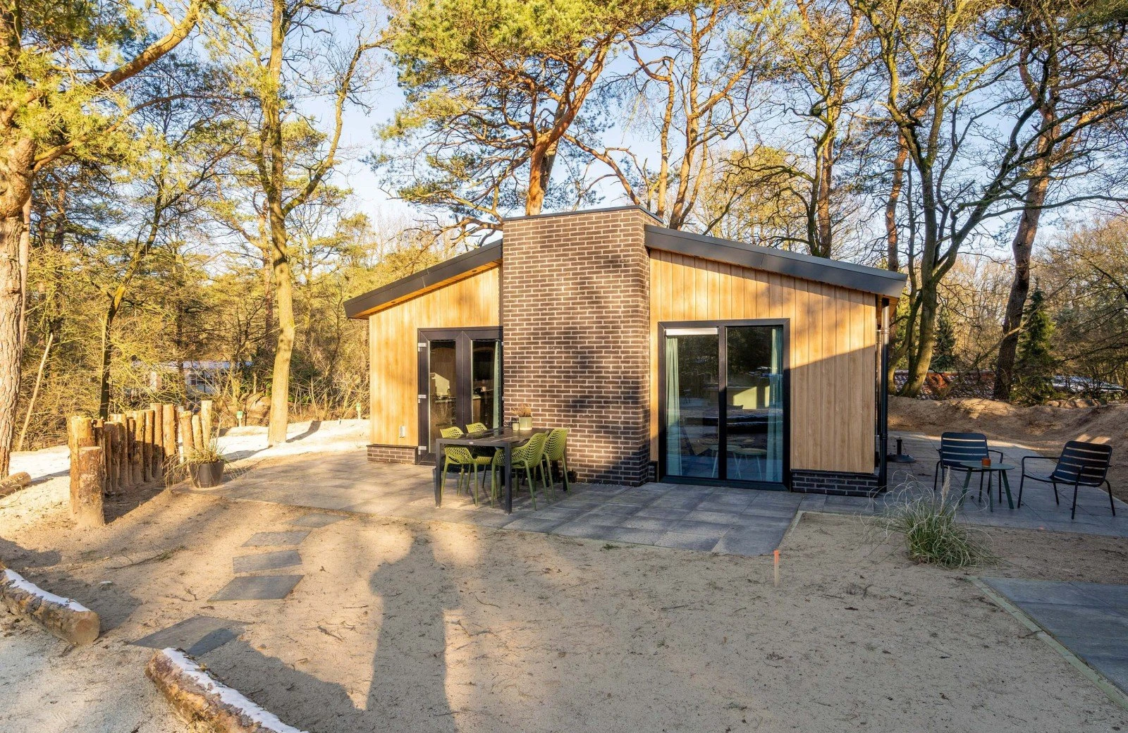 - Terras aan achterzijde en naast chalet met uitzicht op de zandvlakte.