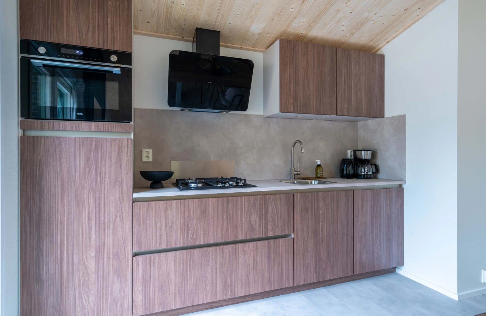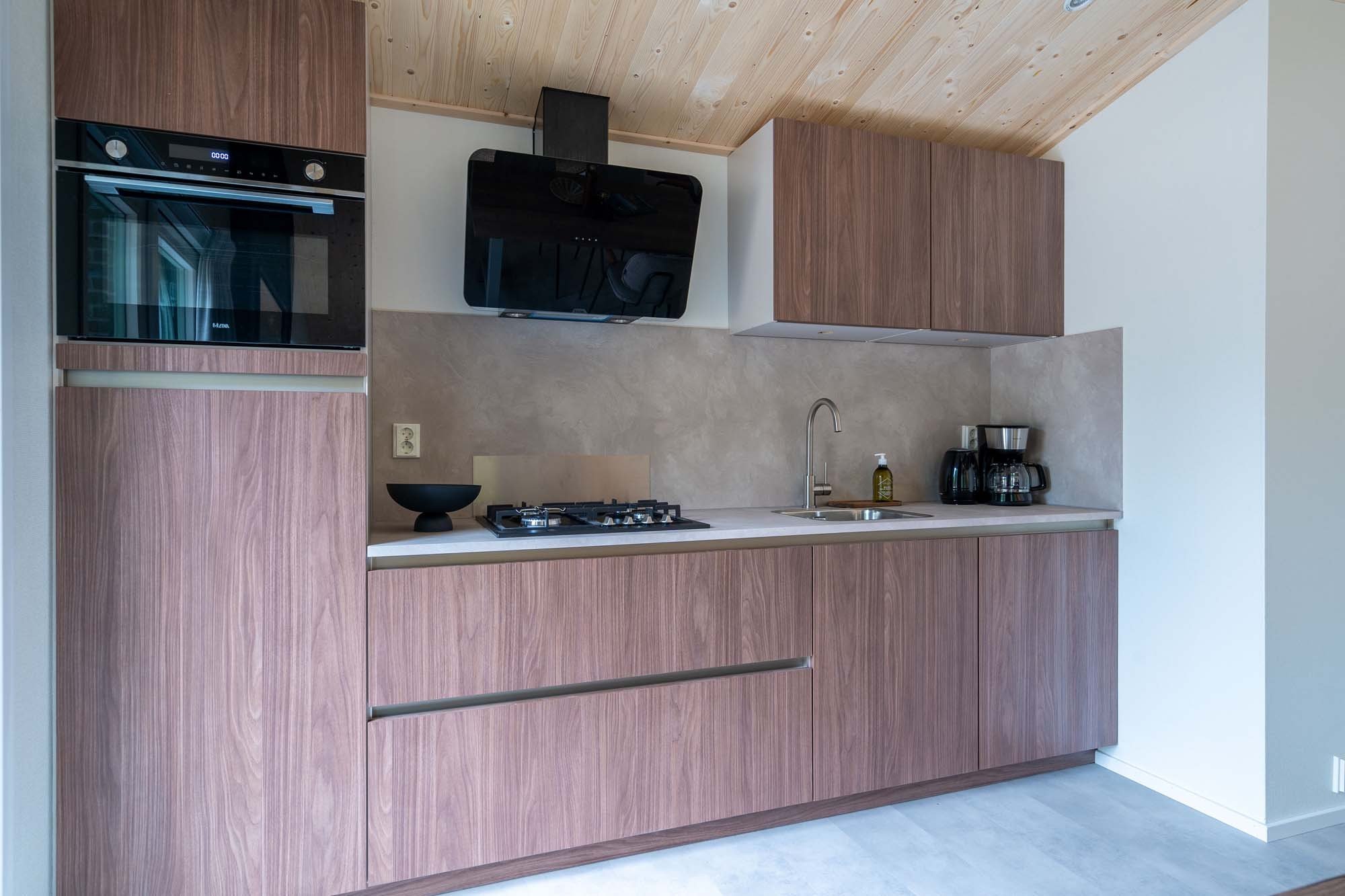 - Open keuken met vaatwasser, 4 pits gasstel, combimagnetron, koelkast met vriesvak, filterkoffiezetapparaat, nespresso apparaat en waterkoker.