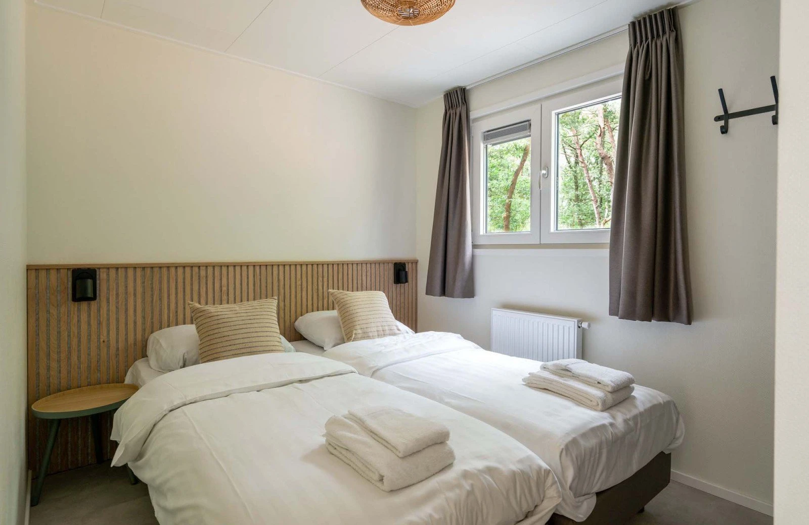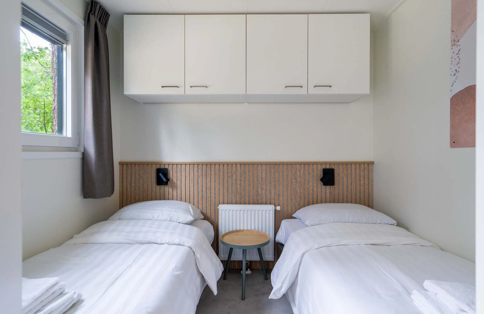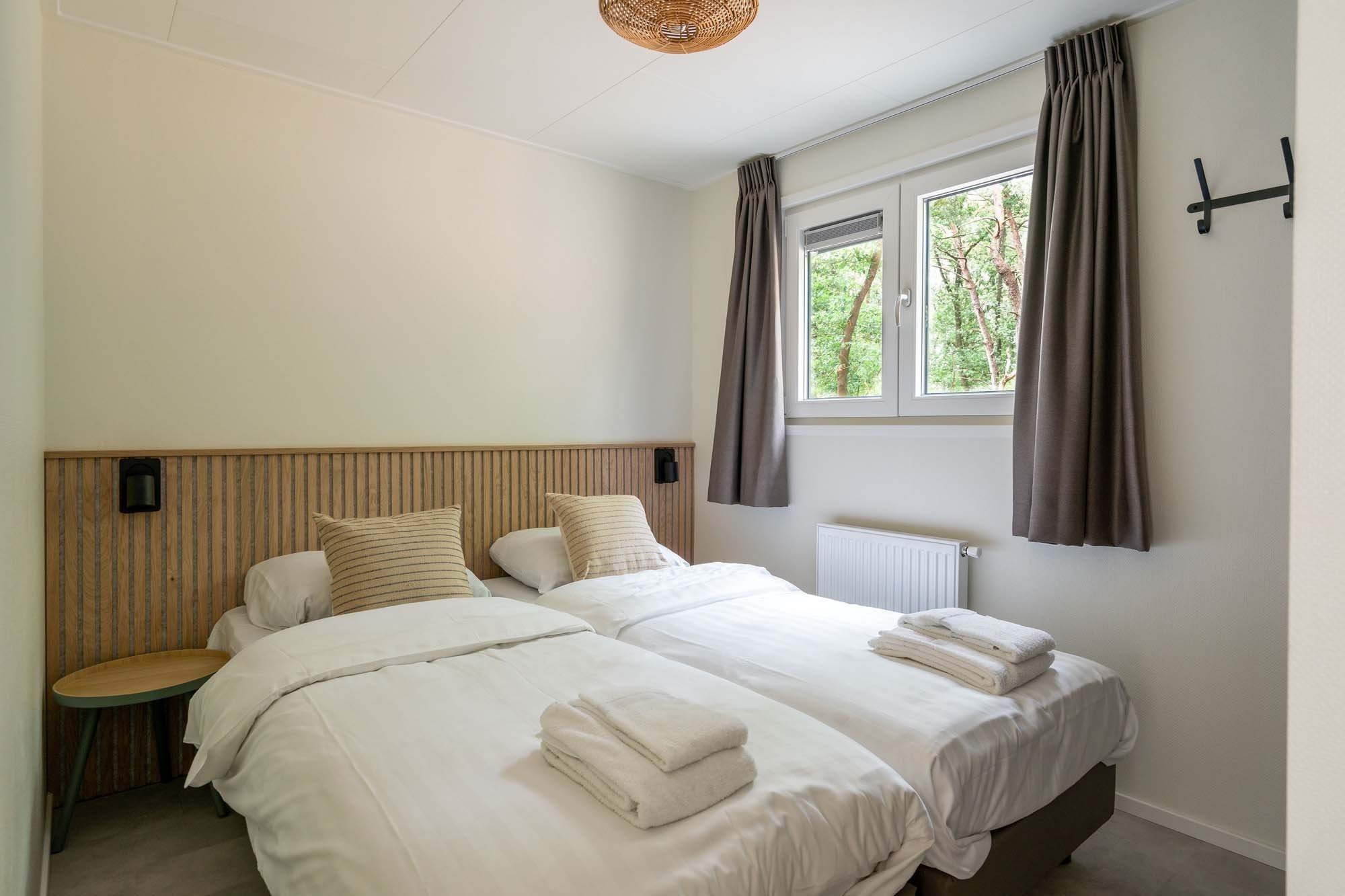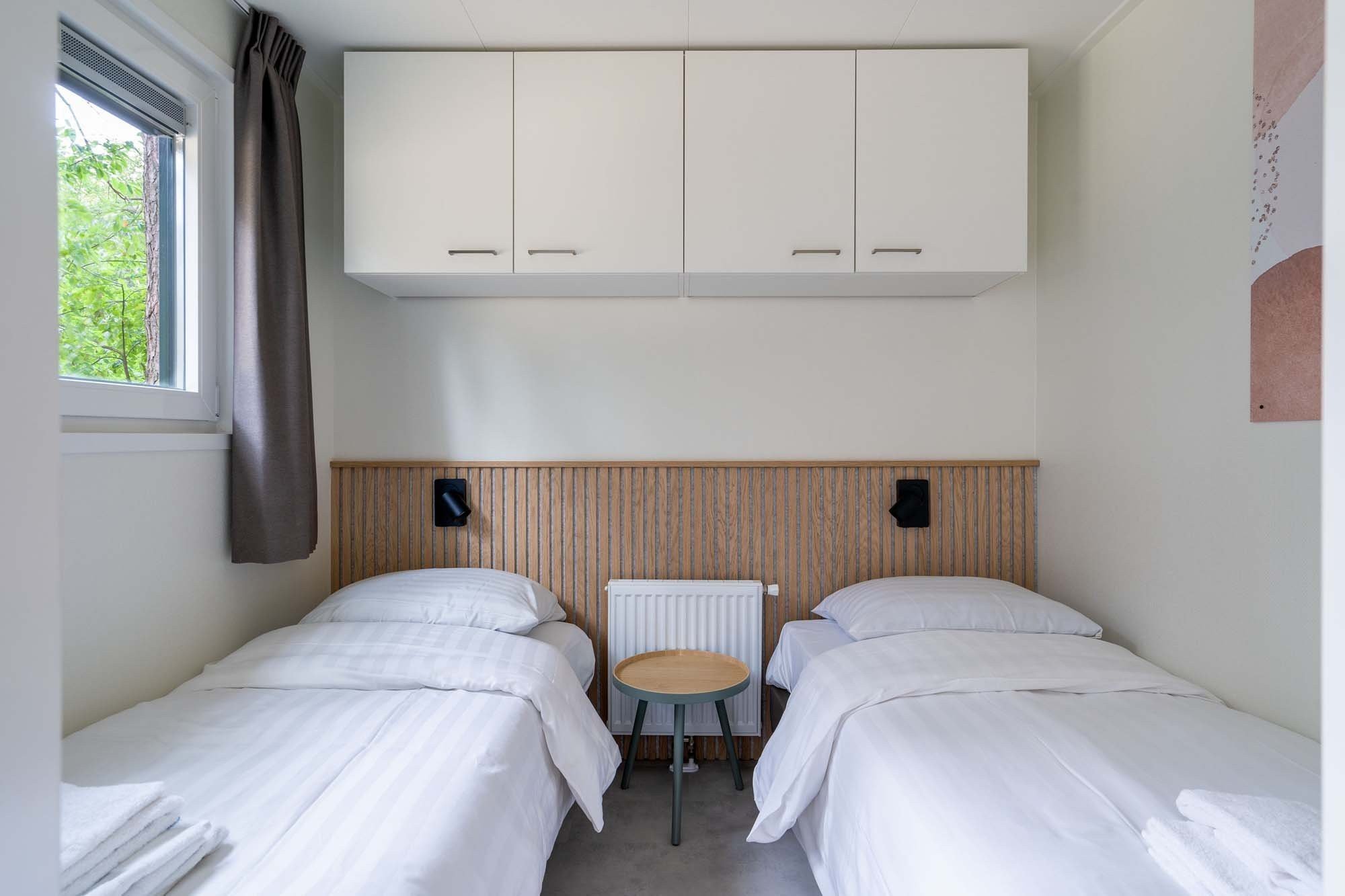 - Twee slaapkamers met elk twee éénpersoonsbedden (boxsprings). Afmeting bedden: 80 x 200 cm.