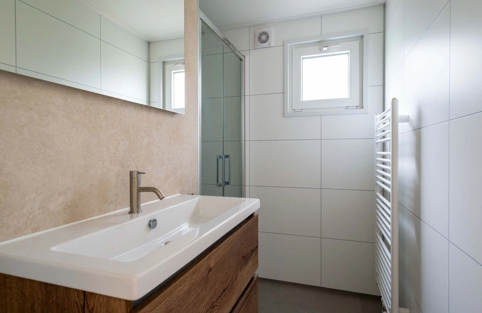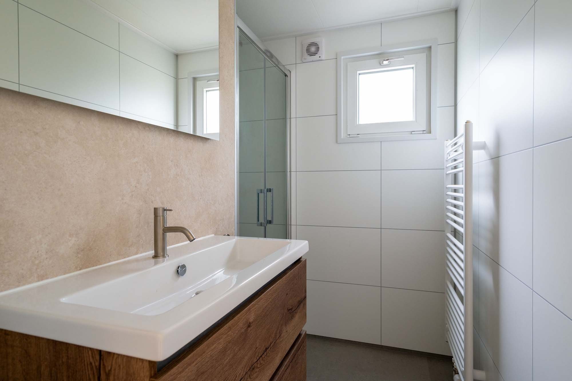 - Badkamer met wastafel en douche.