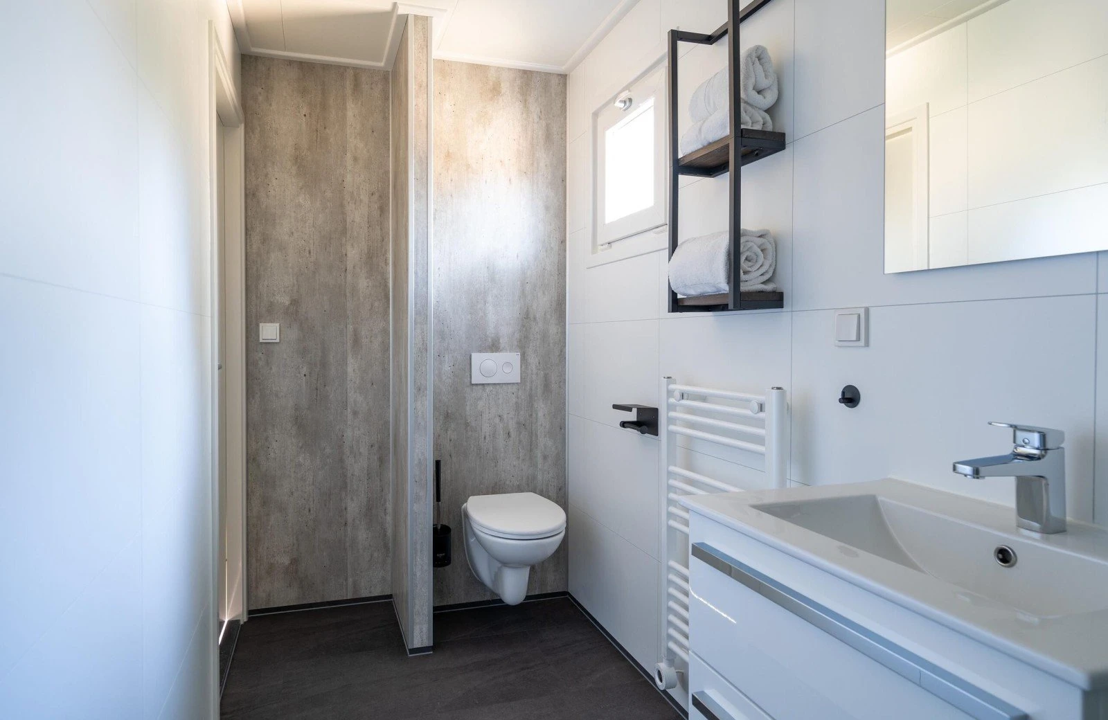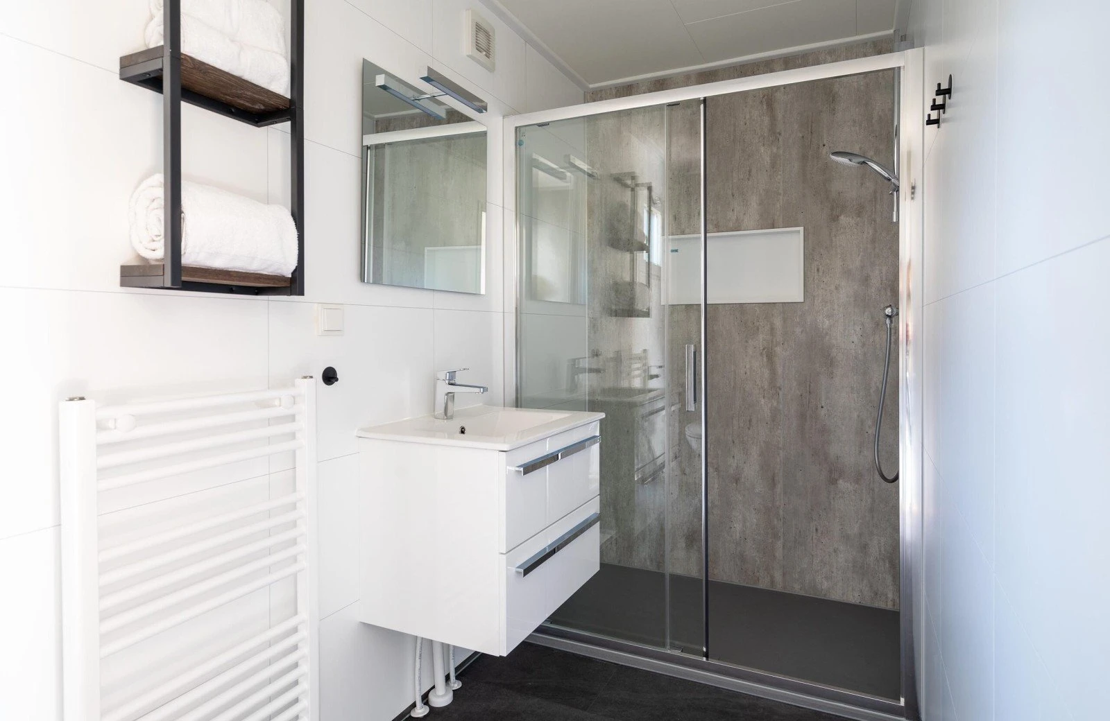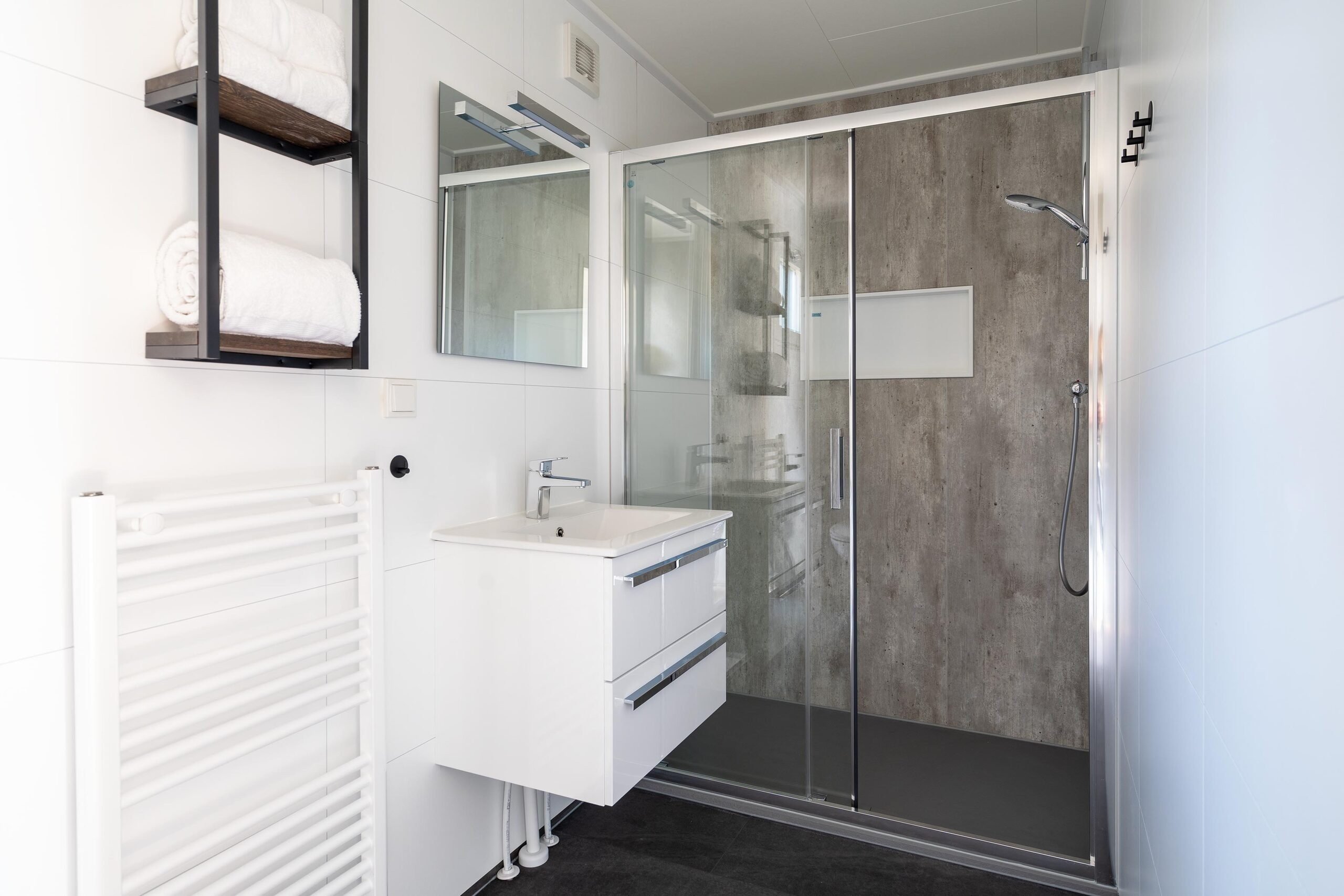 - Badkamer met toilet, wastafel en inloopdouche.